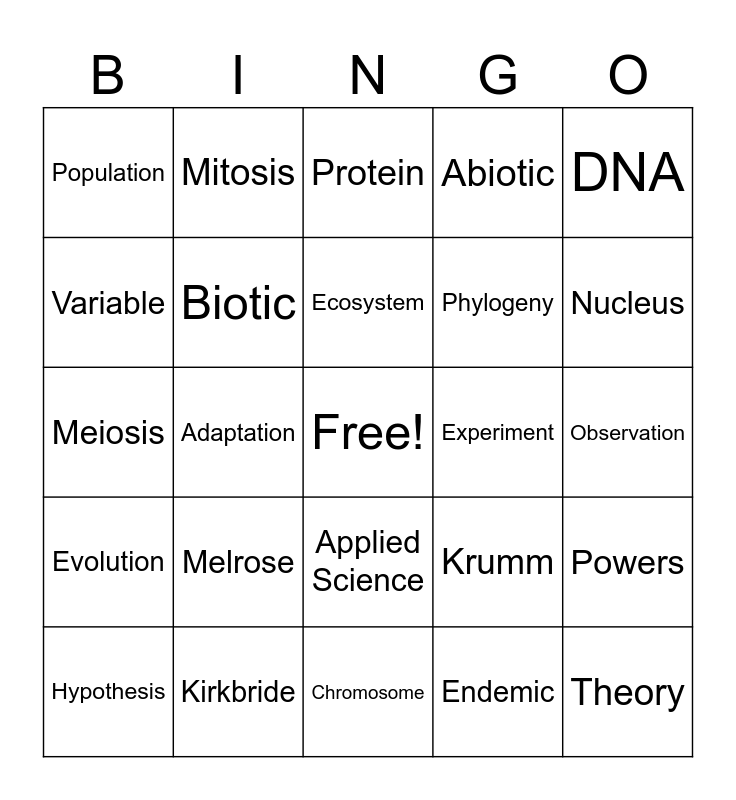This bingo card has a free space and 24 words: Melrose, Kirkbride, Ecosystem, Hypothesis, DNA, Population, Variable, Mitosis, Experiment, Applied Science, Phylogeny, Meiosis, Krumm, Powers, Biotic, Endemic, Observation, Protein, Nucleus, Adaptation, Theory, Evolution, Abiotic and Chromosome.