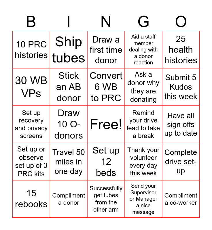 This bingo card has a free space and 24 words: Travel 50 miles in one day, Compliment a donor, Convert 6 WB to PRC, 15 rebooks, 25 health histories, 10 PRC histories, 30 WB VPs, Ship tubes, Remind your drive lead to take a break, Set up 12 beds, Ask a donor why they are donating, Set up recovery and privacy screens, Thank your volunteer every day this week, Complete drive set-up, Stick an AB donor, Send your Supervisor or Manager a nice message, Have all sign offs up to date, Draw a first time donor, Submit 5 Kudos this week, Draw 10 O- donors, Compliment a co-worker, Set up or observe set up of 3 PRC kits, Aid a staff member dealing with a donor reaction and Successfully get tubes from the other arm.