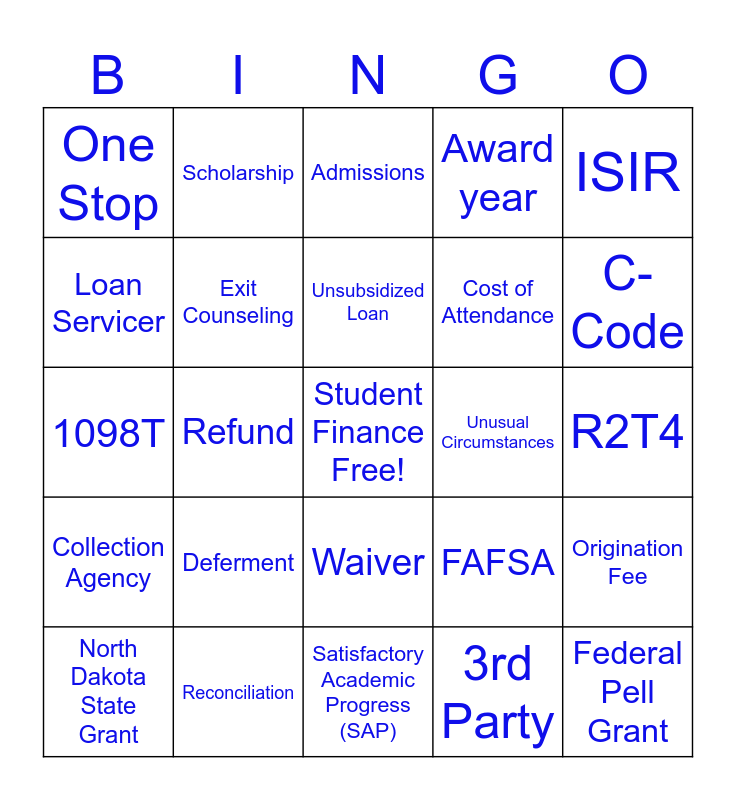 This bingo card has a free space and 49 words: Forebearance, Federal Pell Grant, PLUS Loan, Satisfactory Academic Progress (SAP), Deferment, Loan Limits, Scholarship, Master Promissory Note (MPN), Loan Servicer, Subsidized Loan, Exit Counseling, Award year, Origination Fee, FAFSA, Direct Loan, Work Study, Unsubsidized Loan, Unusual Circumstances, Consolidation, ISIR, Refund, 3rd Party, One Stop, Cost of Attendance, Student Aid Index (SAI), C-Code, North Dakota State Grant, External Scholarship Check, Waiver, Collection Agency, Verification, State Scholarships, Disbursement, Budget Appeal, Reconciliation, FISAP, December Grad, Withdrawal, R2T4, Tuition Calc, Interest Rate, Aviation, Athletics, SEOG, 1098T, Admissions, Graduate, Undergraduate and Hawk.