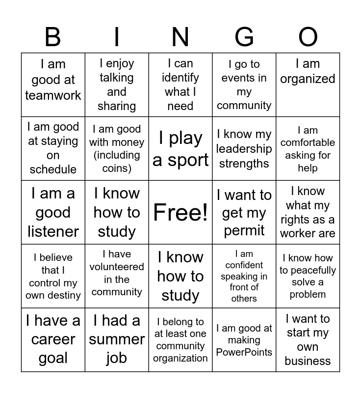 This bingo card has a free space and 24 words: I have volunteered in the community, I had a summer job, I play a sport, I have a career goal, I am organized, I am good at teamwork, I am good at staying on schedule, I enjoy talking and sharing, I want to get my permit, I know how to study, I know my leadership strengths, I am a good listener, I am confident speaking in front of others, I know how to peacefully solve a problem, I am good with money (including coins), I am good at making PowerPoints, I know what my rights as a worker are, I can identify what I need, I am comfortable asking for help, I know how to study, I want to start my own business, I believe that I control my own destiny, I go to events in my community and I belong to at least one community organization.