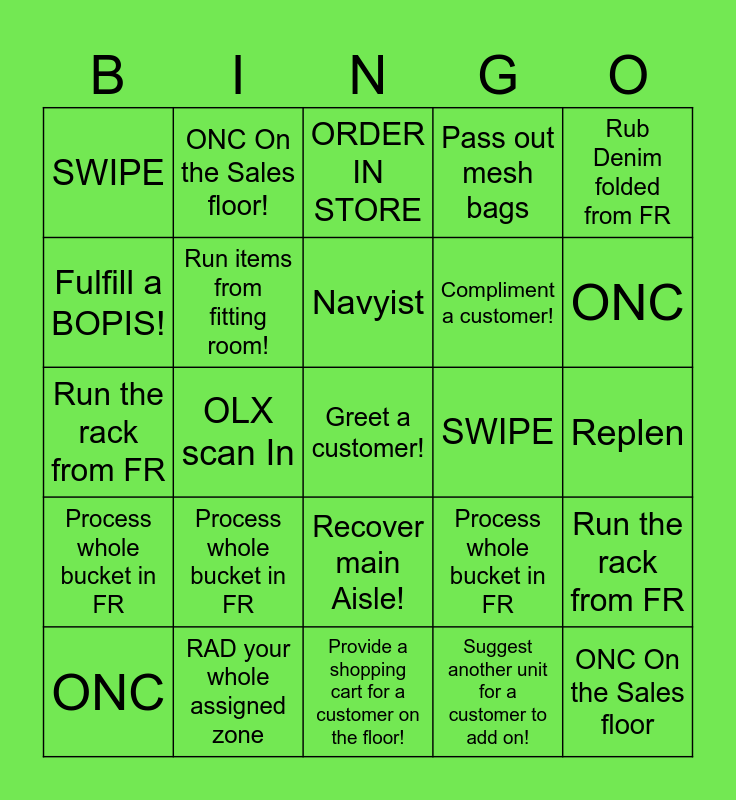 This bingo card has a free space and 24 words: Process whole bucket in FR, RAD your whole assigned zone, Navyist, ONC, Rub Denim folded from FR, SWIPE, Fulfill a BOPIS!, ONC On the Sales floor!, SWIPE, Recover main Aisle!, Compliment a customer!, Run the rack from FR, Process whole bucket in FR, Run the rack from FR, Run items from fitting room!, Suggest another unit for a customer to add on!, Replen, ORDER IN STORE, ONC, OLX scan In, ONC On the Sales floor, Process whole bucket in FR, Pass out mesh bags and Provide a shopping cart for a customer on the floor!.