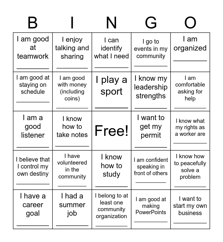 This bingo card has a free space and 24 words: I have volunteered in the community _________, I had a summer job ________, I play a sport ______, I have a career goal ________, I am organized ________, I am good at teamwork ________, I am good at staying on schedule __________, I enjoy talking and sharing ________, I want to get my permit ________, I know how to study ________, I know my leadership strengths ________, I am a good listener ________, I am confident speaking in front of others __________, I know how to peacefully solve a problem __________, I am good with money (including coins) __________, I am good at making PowerPoints ___________, I know what my rights as a worker are ___________, I can identify what I need _________, I am comfortable asking for help __________, I know how to take notes _________, I want to start my own business __________, I believe that I control my own destiny __________, I go to events in my community __________ and I belong to at least one community organization __________.