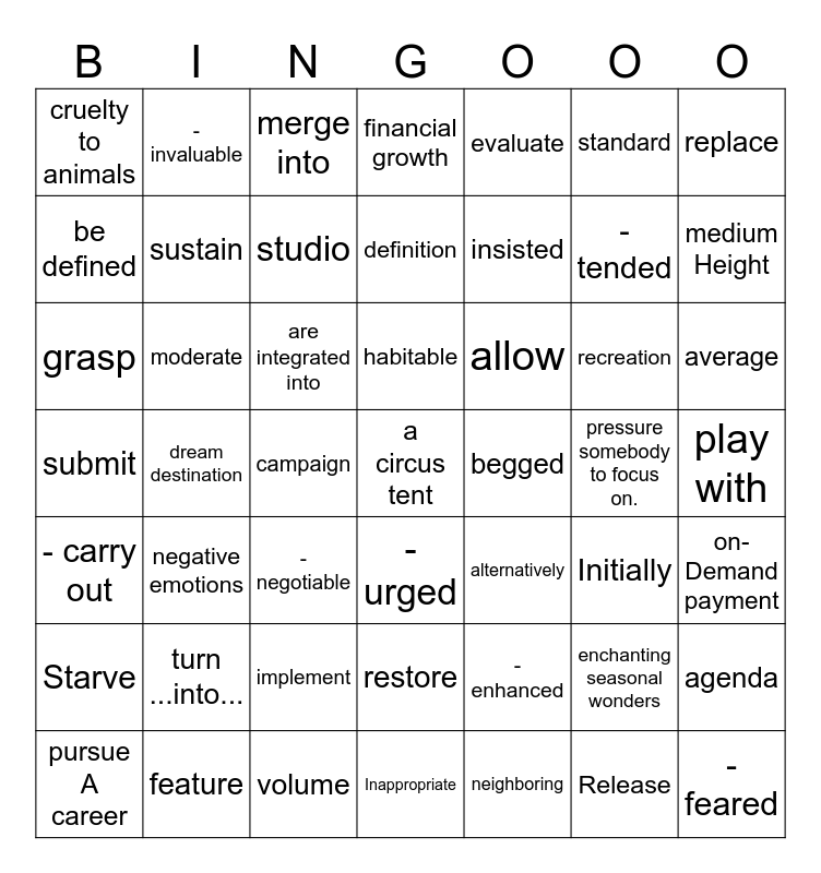 This bingo card has 79 words: connect …to …, turn ...into..., merge into, enchanting seasonal wonders, a breathtaking landscape., Admire it from a distance., on-Demand payment, advanced facilities, Initially, pursue A career, pressure somebody to focus on., the impact on, financial growth, cruelty to animals, address the issue., standard, negative emotions, are integrated into, Imitate, grasp, alternatively, evaluate, definition, be defined, replace, neighboring, feature, Inappropriate, simplify, enhance, studio, highlight the feature., dream destination, a circus tent, average, medium Height, One tire is flat., animal welfare, - urged, - tended, begged, - enhanced, - feared, considerable, - negotiable, - invaluable, play with, - carry out, - set off, - clean up, recreation, insisted, allow, Ultimately, emission, melt, Starve, ecology, Release, habitable, sustain, sustainable, comprehensive, broadcast, policy, footprint, Restrict, implement, harmonious, moderate, submit, originate, volume, restore, conservation, campaign, tolerate, agenda and disposal.