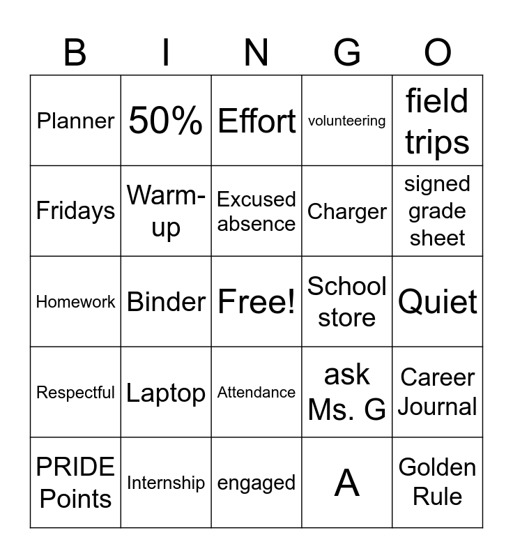 This bingo card has a free space and 24 words: Laptop, Internship, Excused absence, PRIDE Points, field trips, Planner, Fridays, 50%, School store, Attendance, Charger, Homework, ask Ms. G, Career Journal, Warm-up, A, Quiet, Effort, signed grade sheet, Binder, Golden Rule, Respectful, volunteering and engaged.