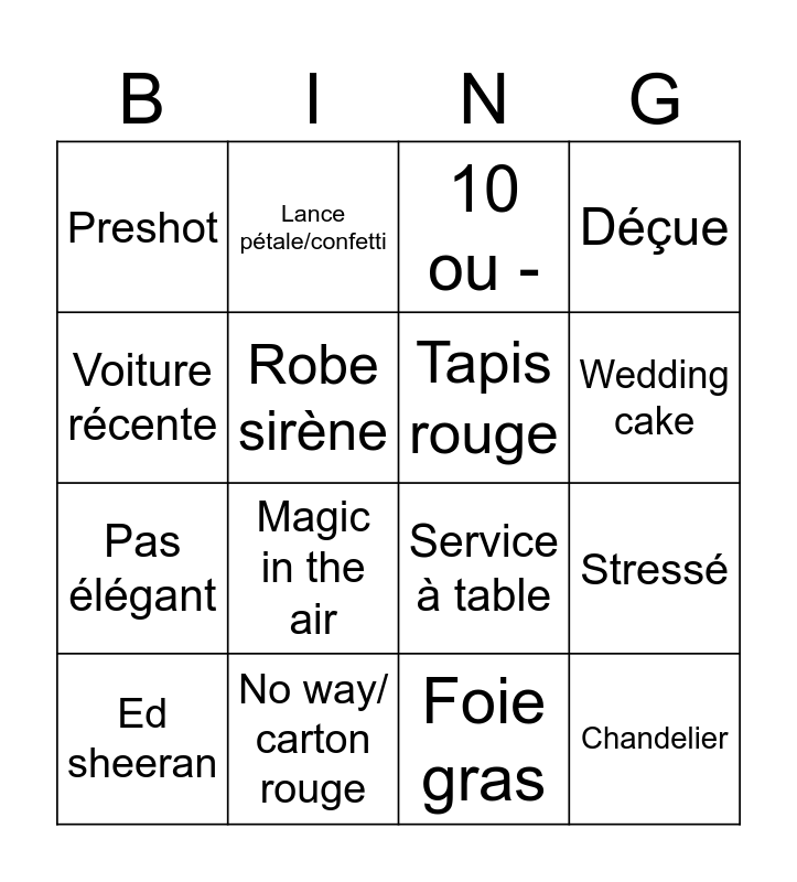 This bingo card has 16 words: No way/ carton rouge, Stressé, 10 ou -, Preshot, Pas élégant, Lance pétale/confetti, Service à table, Foie gras, Voiture récente, Robe sirène, Ed sheeran, Déçue, Magic in the air, Wedding cake, Tapis rouge and Chandelier.