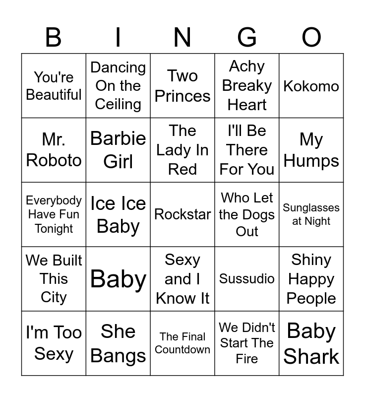 This bingo card has 36 words: Disco Duck, Ob-La-Di, Ob-La-Da, The Fox, Barbie Girl, Sussudio, We Built This City, The Lady In Red, Don't Worry Be Happy, Kokomo, Tip Toe Thru' the Tulips with Me, Ice Ice Baby, Achy Breaky Heart, Cotton Eyed Joe, Who Let the Dogs Out, My Humps, You're Beautiful, Baby Shark, Baby, Rockstar, Two Princes, Sunglasses at Night, Shiny Happy People, She Bangs, I'm Too Sexy, The Final Countdown, Dancing On the Ceiling, Everybody Have Fun Tonight, Friday, I'll Be There For You, Mr. Roboto, Blurred Lines, All About That Bass, We Didn't Start The Fire, Sexy and I Know It, Gangnam Style and Call Me Maybe.