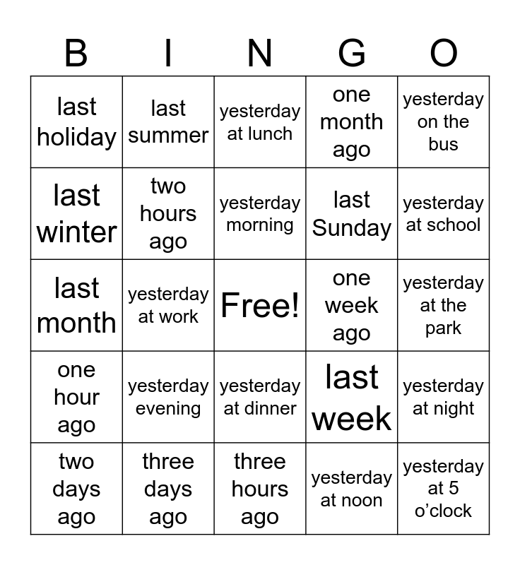 This bingo card has a free space and 42 words: yesterday, yesterday morning, yesterday afternoon, yesterday evening, yesterday at noon, yesterday at night, yesterday at 5 o’clock, yesterday at breakfast, yesterday at lunch, yesterday at dinner, yesterday at the park, yesterday at school, yesterday at work, yesterday on the bus, last night, last week, last weekend, last month, last year, last summer, last winter, last spring, last fall, last holiday, last birthday, last Saturday, last Sunday, last class, one minute ago, ten minutes ago, thirty minutes ago, one hour ago, two hours ago, three hours ago, one day ago, two days ago, three days ago, one week ago, two weeks ago, three weeks ago, one month ago and two months ago.