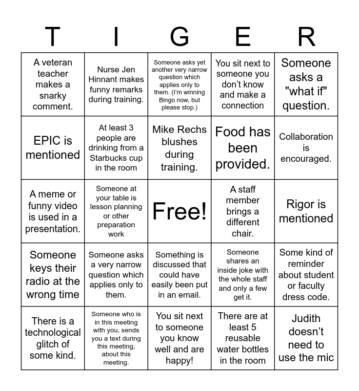 This bingo card has a free space and 24 words: Someone asks a very narrow question which applies only to them., Someone who is in this meeting with you, sends you a text during this meeting, about this meeting., Mike Rechs blushes during training., There is a technological glitch of some kind., Someone asks a "what if" question., A veteran teacher makes a snarky comment., EPIC is mentioned, Nurse Jen Hinnant makes funny remarks during training., A staff member brings a different chair., Something is discussed that could have easily been put in an email., Food has been provided., A meme or funny video is used in a presentation., Someone shares an inside joke with the whole staff and only a few get it., Some kind of reminder about student or faculty dress code., At least 3 people are drinking from a Starbucks cup in the room, There are at least 5 reusable water bottles in the room, Rigor is mentioned, Someone asks yet another very narrow question which applies only to them. (I’m winning Bingo now, but please stop.), Collaboration is encouraged., Someone at your table is lesson planning or other preparation work, Judith doesn’t need to use the mic, Someone keys their radio at the wrong time, You sit next to someone you don’t know and make a connection and You sit next to someone you know well and are happy!.