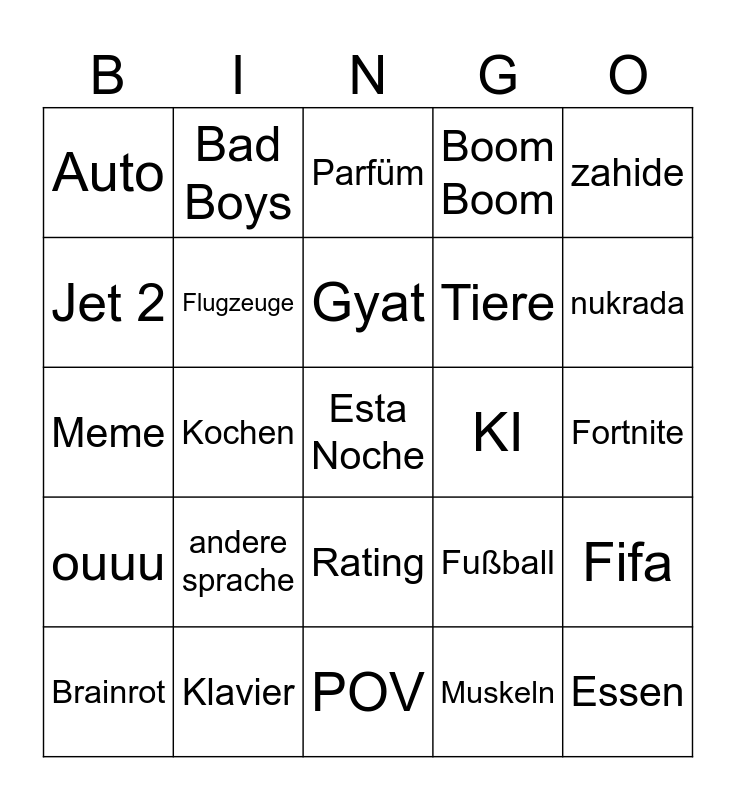 This bingo card has a free space and 24 words: andere sprache, Klavier, Gyat, Brainrot, zahide, Auto, Jet 2, Bad Boys, KI, Rating, Tiere, Meme, Fußball, Fifa, Flugzeuge, Muskeln, Fortnite, Parfüm, nukrada, Kochen, Essen, ouuu, Boom Boom and POV.