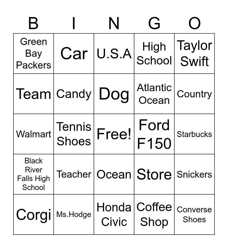 This bingo card has a free space and 24 words: Teacher, Ms.Hodge, Dog, Corgi, Taylor Swift, Green Bay Packers, Team, Car, Ford F150, Ocean, Atlantic Ocean, Walmart, Store, Snickers, Candy, Coffee Shop, Starbucks, U.S.A, Country, Tennis Shoes, Converse Shoes, Black River Falls High School, High School and Honda Civic.