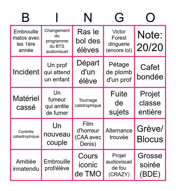 This bingo card has a free space and 24 words: Un nouveau couple, Embrouille prof/élève, Départ d'un élève, Amitiée innatendu, Note: 20/20, Embrouille matos avec les 1ère année, Incident, Changement du programme du BTS audiovisuel, Fuite de sujets, Film d'horreur (CAA avec Denis), Pétage de plomb d'un prof, Matériel cassé, Alternance trouvée, Grève/ Blocus, Un prof qui attend un enfant, Projet audiovisuel de fou (CRAZY), Projet classe entière, Ras le bol des élèves, Cafet bondée, Un fumeur qui arrête de fumer, Grosse soirée (BDE), Contrôle catastrophique, Victor Forest dinguerie (encore lol) and Cours iconic de TMO.