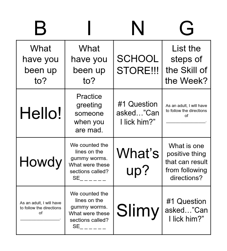 ⚠ This card has duplicate items: What’s up? (2), Hello! (2), #1 Question asked…”Can I lick him?” (2), What is one positive thing that can result from following directions? (2), List the steps of the Skill of the Week? (2), As an adult, I will have to follow the directions of _________________. (2), Slimy (2), We counted the lines on the gummy worms. What were these sections called? SE_ _ _ _ _ _ (2), We have been in school 3 weeks already! (2), Willkommen (2), What have you been up to? (2), How’s everything? (2), SCHOOL STORE!!! (2), Outdoor Community (2), Practice greeting someone when you are mad. (2), Practice greeting someone when you aren’t in the mood to. (2), Howdy (2), What is much of soil composed of? (2), Would you ever eat an exotic food like worms? What would you try? (2), Kowabunga Dude! (Who says this?) (2)