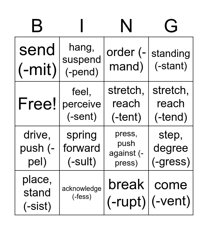 This bingo card has 16 words: acknowledge (-fess), step, degree (-gress), order (-mand), send (-mit), drive, push (-pel), hang, suspend (-pend), press, push against (-press), break (-rupt), Free!, feel, perceive (-sent), place, stand (-sist), standing (-stant), spring forward (-sult), stretch, reach (-tend), stretch, reach (-tent) and come (-vent).