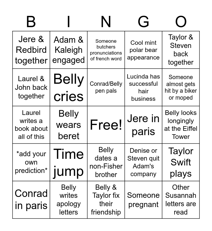 This bingo card has a free space and 24 words: Time jump, Belly writes apology letters, Conrad/Belly pen pals, Conrad in paris, Taylor & Steven back together, Jere & Redbird together, Laurel & John back together, Adam & Kaleigh engaged, Jere in paris, Belly dates a non-Fisher brother, Lucinda has successful hair business, Laurel writes a book about all of this, Denise or Steven quit Adam's company, Taylor Swift plays, Belly cries, Someone pregnant, Belly looks longingly at the Eiffel Tower, Someone butchers pronunciations of french word, Someone almost gets hit by a biker or moped, Belly wears beret, Other Susannah letters are read, *add your own prediction*, Cool mint polar bear appearance and Belly & Taylor fix their friendship.