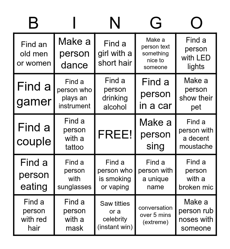 This bingo card has a free space and 24 words: Find a person with sunglasses, Find a person with a mask, Find a person drinking alcohol, Find a person with red hair, Find a person with LED lights, Find an old men or women, Find a gamer, Make a person dance, Make a person sing, Find a person who is smoking or vaping, Find a person in a car, Find a couple, Find a person with a unique name, Find a person with a broken mic, Find a person who plays an instrument, conversation over 5 mins (extreme), Find a person with a decent moustache, Find a girl with a short hair, Make a person show their pet, Find a person with a tattoo, Make a person rub noses with someone, Find a person eating, Make a person text something nice to someone and Saw titties or a celebrity (instant win).