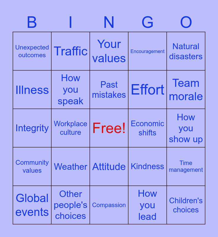 This bingo card has a free space and 24 words: Weather, Other people's choices, Past mistakes, Global events, Natural disasters, Unexpected outcomes, Illness, Traffic, Economic shifts, Attitude, Effort, Integrity, Kindness, Time management, How you speak, How you lead, How you show up, Your values, Team morale, Workplace culture, Children's choices, Community values, Encouragement and Compassion.
