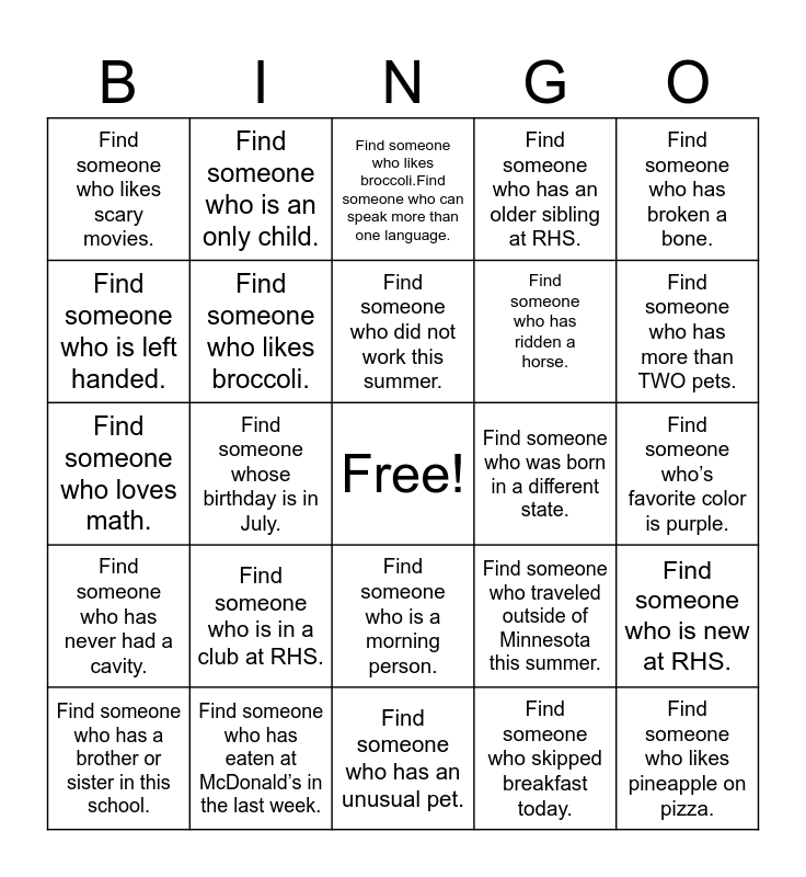 This bingo card has a free space and 29 words: Find someone who has a brother or sister in this school., Find someone who likes to sing., Find someone whose birthday is in July., Find someone who is the youngest child in their family., Find someone who likes scary movies., Find someone who likes broccoli.Find someone who can speak more than one language., Find someone who likes broccoli., Find someone who is in a club at RHS., Find someone who was born in a different state., Find someone who has eaten at McDonald’s in the last week., Find someone who’s favorite color is purple., Find someone who likes pineapple on pizza., Find someone who has an unusual pet., Find someone who skipped breakfast today., Find someone who has more than TWO pets., Find someone who does not like chocolate., Find someone who is a morning person., Find someone who has never had a cavity., Find someone who has broken a bone., Find someone who loves math., Find someone who traveled outside of Minnesota this summer., Find someone who plays two sports., Find someone who has ridden a horse., Find someone who is left handed., Find someone who has an older sibling at RHS., Find someone who is an only child., Find someone who is new at RHS., Find someone who did not work this summer. and Find someone who does not drive..