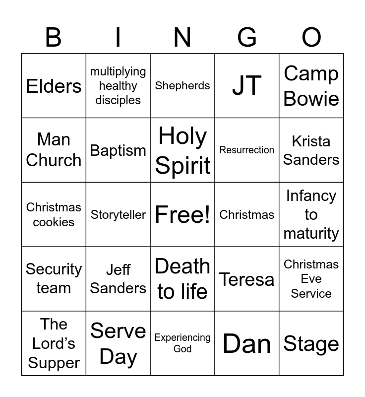 This bingo card has a free space and 104 words: Clearfork, Ridglea Theater, Camp Bowie, Base Camp, Kids’ Ministry, Man Camp, Community groups, Women’s ministry, Preschool, Babies, Toddlers, Elementary, Worship, Sermon, Forkies, Membership, Shepherds, Ministry Safe, Volunteer Screening, Set up team, Tear down team, Coffee team, Hospitality, Parking posse, Frontlines, Jeff Sanders, Krista Sanders, JT, Jacquie, Michael, Teresa, Dan, Josh, Matt, David, Bible, Jesus, God, Holy Spirit, Serve Day, Serving, Security team, Young Adults, Man Church, Women’s Bible study, Elders, Bat team, Stage, Chairs, Connex, Banners, Traffic cones, AV/production team, Worship team, College ministry, Sept 17, CERA, Watermark, Church plant, Death to life, Infancy to maturity, Discipleship compass, Grounded in the gospel, Rooted in scripture, Empowered by the spirit, Committed to authenticity, Moved to love others, multiplying healthy disciples, Christmas cookies, Storyteller, Experiencing God, Acts, Deep Love, Baby Dedication, Kids’ leader training, Launching multipliers, Young Adult equipping, The Lord’s Supper, Night of prayer, Worship night, CF, Young Adult Retreat, Baptism, Easter, Christmas, Thanksgiving, Valentine’s Day, New Year’s Day, Mother’s Day, Father’s Day, 4th of July, Memorial Day, Labor Day, Christmas Eve Service, Services, Good Friday service, Cross, Resurrection, Psalm 78:4, Take heart, Ft Worth, Jesus has overcome, Podcast and Church center.