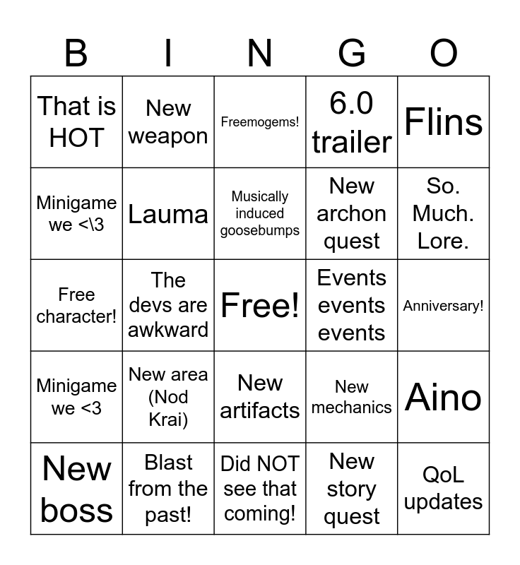 This bingo card has a free space and 24 words: New area (Nod Krai), Blast from the past!, Musically induced goosebumps, New boss, Flins, That is HOT, Minigame we <\3, New weapon, Events events events, New artifacts, New archon quest, Free character!, New mechanics, Aino, Lauma, New story quest, Anniversary!, Freemogems!, So. Much. Lore., The devs are awkward, QoL updates, Minigame we <3, 6.0 trailer and Did NOT see that coming!.