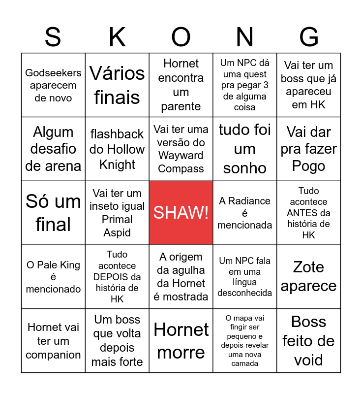 This bingo card has a free space and 24 words: Hornet vai ter um companion, Tudo acontece DEPOIS da história de HK, Vai ter uma versão do Wayward Compass, O mapa vai fingir ser pequeno e depois revelar uma nova camada, Vai ter um boss que já apareceu em HK, Godseekers aparecem de novo, Vários finais, Hornet encontra um parente, A Radiance é mencionada, Tudo acontece ANTES da história de HK, Só um final, flashback do Hollow Knight, Um NPC fala em uma língua desconhecida, Zote aparece, Algum desafio de arena, Um boss que volta depois mais forte, Hornet morre, Um NPC dá uma quest pra pegar 3 de alguma coisa, Vai dar pra fazer Pogo, O Pale King é mencionado, Vai ter um inseto igual Primal Aspid, A origem da agulha da Hornet é mostrada, tudo foi um sonho and Boss feito de void.