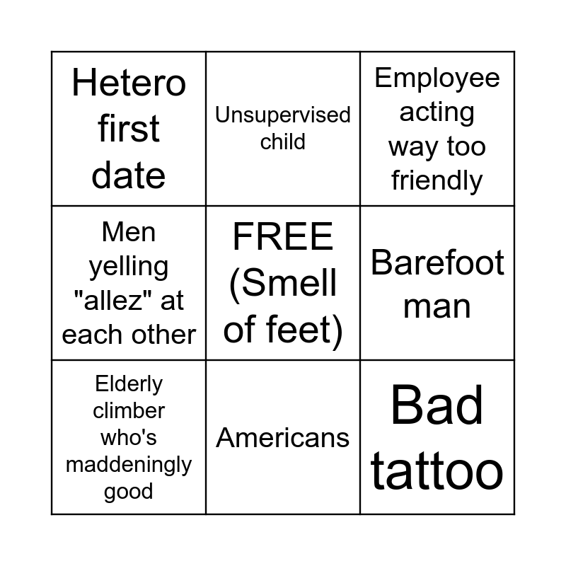 This bingo card has a free space and 8 words: Barefoot man, Employee acting way too friendly, Unsupervised child, Elderly climber who's maddeningly good, Hetero first date, Bad tattoo, Men yelling "allez" at each other and Americans.