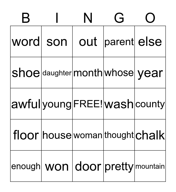 This bingo card has a free space and 24 words: house, won, month, enough, else, word, shoe, son, wash, woman, whose, awful, thought, chalk, daughter, pretty, county, out, year, young, mountain, floor, parent and door.