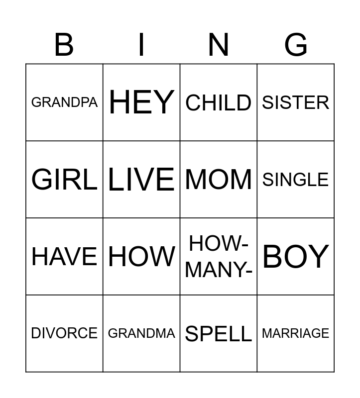 This bingo card has 20 words: BOY, BROTHER, CHILD, DAD, DIVORCE, GIRL, GRANDMA, GRANDPA, HAVE, HEY, HOW, HOW-MANY-, LIVE, MARRIAGE, MOM, parents, SINGLE, SISTER, SPELL and WORK.