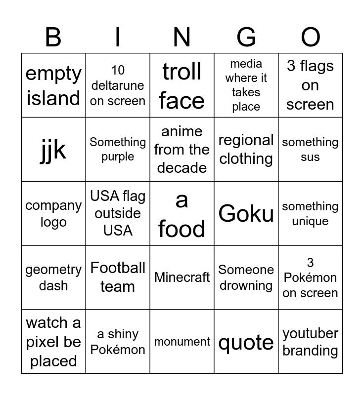 This bingo card has a free space and 24 words: Football team, a shiny Pokémon, anime from the decade, watch a pixel be placed, 3 flags on screen, empty island, jjk, 10 deltarune on screen, Goku, Minecraft, regional clothing, company logo, Someone drowning, 3 Pokémon on screen, Something purple, quote, something unique, troll face, something sus, USA flag outside USA, youtuber branding, geometry dash, media where it takes place and monument.