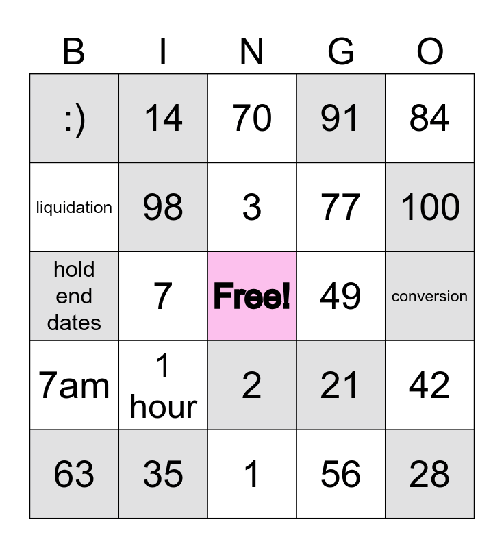This bingo card has a free space and 24 words: 1 hour, 35, 3, 63, 84, :), liquidation, 14, 49, 2, 77, hold end dates, 21, 42, 98, 56, conversion, 70, 100, 7, 28, 7am, 91 and 1.