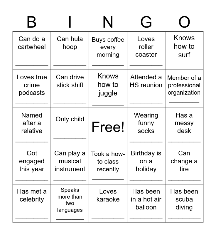 This bingo card has a free space and 24 words: Can play a musical instrument _________, Speaks more than two languages _________, Knows how to juggle ________, Has met a celebrity _________, Knows how to surf ________, Can do a cartwheel _________, Loves true crime podcasts _________, Can hula hoop _________, Wearing funny socks _________, Took a how-to class recently _________, Attended a HS reunion _________, Named after a relative _________, Birthday is on a holiday _________, Can change a tire _________, Can drive stick shift _________, Has been in a hot air balloon _________, Has a messy desk _________, Buys coffee every morning _________, Member of a professional organization _________, Only child _________, Has been scuba diving _________, Got engaged this year _________, Loves roller coaster _________ and Loves karaoke _________.