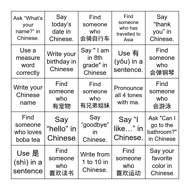 This bingo card has 25 words: Say “hello” in Chinese, Write from 1 to 10 in Chinese., Say " I am in 8th grade" in Chinese, Use 是 (shì) in a sentence, Say “thank you” in Chinese., Ask “What’s your name?” in Chinese., Use a measure word correctly, Say today’s date in Chinese., Pronounce all 4 tones with ma., Say “goodbye” in Chinese., Use 有 (yǒu) in a sentence., Write your Chinese name, Say “I like…” in Chinese., Ask "Can I go to the bathroom?" in Chinese, Write your birthday in Chinese, Say your favorite color in Chinese, Find someone who 会游泳, Find someone who 会骑自行车, Find someone who 会弹钢琴, Find someone who 有宠物, Find someone who 有兄弟姐妹, Find someone who 喜欢读书, Find someone who loves boba tea, Find someone who has travelled to Asia and Find someone who 喜欢运动.