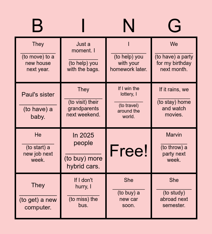This bingo card has 21 words: If I don't hurry, I ___________ (to miss) the bus., They _________ (to have) a barbecue this weekend., Just a moment. I __________ (to help) you with the bags., I think my mother ___________ (to like ) this CD, She ___________ (to buy) a new car soon., If I win the lottery, I ___________ (to travel) around the world., They ____________ (to move) to a new house next year., I ____________ (to help) you with your homework later., Free!, If it rains, we ___________ (to stay) home and watch movies., He ___________ (to start) a new job next week., We _____________ (to have) a party for my birthday next month., She ____________ (to study) abroad next semester., If it gets dark, we __________ (to turn on) the lights., They _____________ (to visit) their grandparents next weekend., Philipp __________ (to be) 15 next Wednesday., They ___________ (to get) a new computer., In 2025 people __________ (to buy) more hybrid cars., Paul's sister ___________ (to have) a baby., Marvin _________ (to throw) a party next week. and Look at the clouds! It _________ soon..