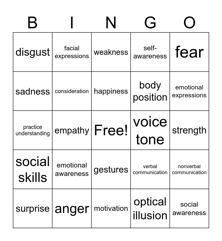This bingo card has a free space and 24 words: emotional awareness, anger, happiness, surprise, fear, disgust, sadness, facial expressions, voice tone, gestures, body position, practice understanding, verbal communication, nonverbal communication, consideration, optical illusion, strength, weakness, emotional expressions, empathy, social awareness, social skills, self-awareness and motivation.