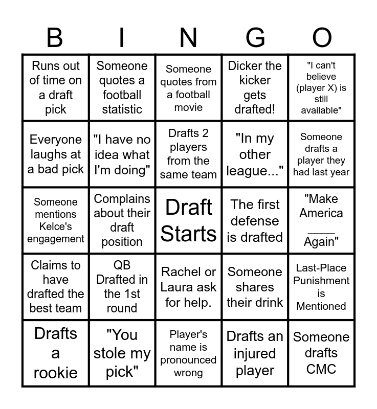 This bingo card has a free space and 24 words: Drafts a rookie, QB Drafted in the 1st round, Drafts 2 players from the same team, Drafts an injured player, "I can't believe (player X) is still available", Runs out of time on a draft pick, Someone quotes a football statistic, Someone quotes from a football movie, The first defense is drafted, "Make America ____ Again", Someone mentions Kelce's engagement, "I have no idea what I'm doing", Someone shares their drink, Last-Place Punishment is Mentioned, Everyone laughs at a bad pick, "You stole my pick", Player's name is pronounced wrong, Dicker the kicker gets drafted!, Someone drafts a player they had last year, Claims to have drafted the best team, Complains about their draft position, Rachel or Laura ask for help., "In my other league..." and Someone drafts CMC.