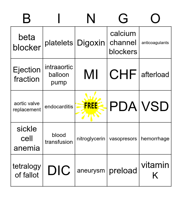 This bingo card has a free space and 29 words: tetralogy of fallot, cardiac output, endocarditis, CABG, beta blocker, Digoxin, intraaortic balloon pump, blood transfusion, PDA, DIC, VSD, vitamin K, aneurysm, preload, afterload, IV fluids, nitroglycerin, sickle cell anemia, anticoagulants, aortic valve replacement, vasopresors, diuretics, CHF, Ejection fraction, calcium channel blockers, platelets, hemorrhage, MI and arterial BP monitoring.