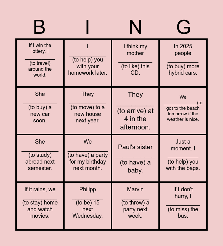 This bingo card has 23 words: If I don't hurry, I ___________ (to miss) the bus., They _________ (to have) a barbecue this weekend., We _____________(to go) to the beach tomorrow if the weather is nice., I think my parents ____________ (to celebrate) their anniversary next month., She ___________ (to buy) a new car soon., If I win the lottery, I ___________ (to travel) around the world., They ____________ (to move) to a new house next year., I ____________ (to help) you with your homework later., If it rains, we ___________ (to stay) home and watch movies., He ___________ (to start) a new job next week., We _____________ (to have) a party for my birthday next month., She ____________ (to study) abroad next semester., If it gets dark, we __________ (to turn on) the lights., They _____________ (to visit) their grandparents next weekend., Philipp __________ (to be) 15 next Wednesday., They ___________ (to get) a new computer., I think my mother ___________ (to like) this CD., Paul's sister ___________ (to have) a baby., They __________ (to arrive) at 4 in the afternoon., Just a moment. I __________ (to help) you with the bags., In 2025 people __________ (to buy) more hybrid cars., Marvin _________ (to throw) a party next week. and Look at the clouds! It _________ (to rain) soon..