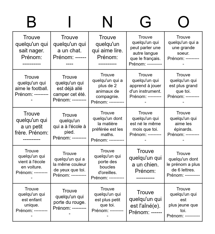 This bingo card has a free space and 24 words: Trouve quelqu'un qui a la même couleur de yeux que toi. Prénom: ----------, Trouve quelqu'un qui porte du rouge. Prénom: ----------, Trouve quelqu'un qui a plus de 2 animaux de compagnie. Prénom: ----------, Trouve quelqu'un qui est enfant unique. Prénom: ----------, Trouve quelqu'un qui a une grande soeur. Prénom: ----------, Trouve quelqu'un qui sait nager. Prénom: ----------, Trouve quelqu'un qui aime le football. Prénom: ----------, Trouve quelqu'un qui a un chat. Prénom: ----------, Trouve quelqu'un qui est né le même mois que toi. Prénom: ----------, Trouve quelqu'un qui porte des boucles d'oreilles. Prénom: ----------, Trouve quelqu'un qui apprend à jouer d'un instrument. Prénom: ----------, Trouve quelqu'un qui a un petit frère. Prénom: ----------, Trouve quelqu'un qui a un chien. Prénom: ----------, Trouve quelqu'un dont le prénom a plus de 6 lettres. Prénom: ----------, Trouve quelqu'un qui est déjà allé camper cet été. Prénom: ---------, Trouve quelqu'un qui est l'aîné(e). Prénom: ------, Trouve quelqu'un qui aime les épinards. Prénom: ----------, Trouve quelqu'un qui aime lire. Prénom: ----------, Trouve quelqu'un qui est plus grand que toi. Prénom: ----------, Trouve quelqu'un qui a à l'école à pied. Prénom: ---------, Trouve quelqu'un qui est plus jeune que toi. Prénom: ----------, Trouve quelqu'un qui vient à l'école en voiture. Prénom: ----------, Trouve quelqu'un qui peut parler une autre langue que le français. Prénom: ---------- and Trouve quelqu'un qui est plus petit que toi. Prénom: ----------.