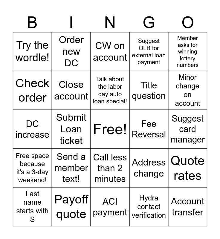 This bingo card has a free space and 24 words: Send a member text!, Payoff quote, Talk about the labor day auto loan special!, Last name starts with S, Member asks for winning lottery numbers, Try the wordle!, Check order, Order new DC, Fee Reversal, Call less than 2 minutes, Title question, DC increase, Address change, Quote rates, Close account, Hydra contact verification, Suggest card manager, CW on account, Minor change on account, Submit Loan ticket, Account transfer, Free space because it's a 3-day weekend!, Suggest OLB for external loan payment and ACI payment.
