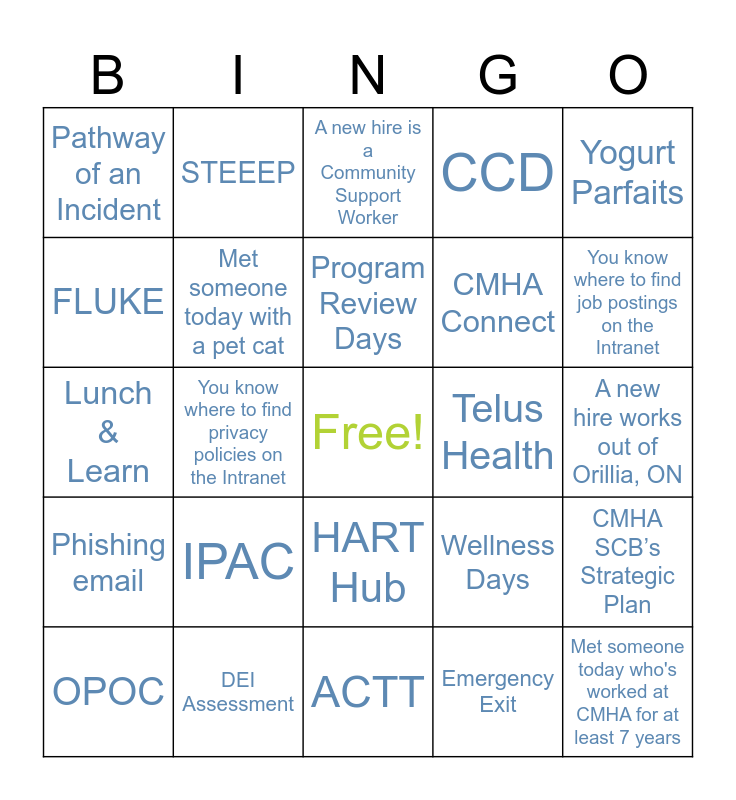 This bingo card has a free space and 24 words: IPAC, DEI Assessment, Program Review Days, OPOC, Yogurt Parfaits, Pathway of an Incident, FLUKE, STEEEP, Telus Health, HART Hub, CMHA Connect, Lunch & Learn, Wellness Days, CMHA SCB’s Strategic Plan, Met someone today with a pet cat, Emergency Exit, A new hire works out of Orillia, ON, A new hire is a Community Support Worker, You know where to find job postings on the Intranet, You know where to find privacy policies on the Intranet, Met someone today who's worked at CMHA for at least 7 years, Phishing email, CCD and ACTT.