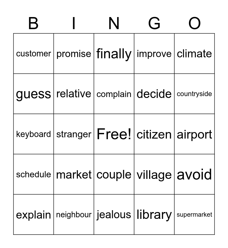 This bingo card has a free space and 30 words: neighbour, excited, stranger, bored, customer, finally, relative, couple, citizen, jealous, airport, supermarket, library, factory, countryside, island, village, schedule, market, climate, keyboard, furniture, promise, decide, guess, improve, avoid, explain, complain and discover.