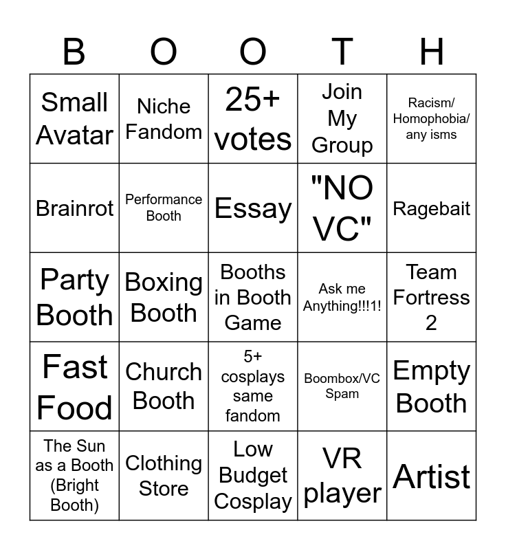 This bingo card has a free space and 44 words: Obby Booth, Artist, Religous / cult booth, The Sun as a Booth (Bright Booth), Deltagoon / Undermid, VR player, 25+ votes, Anti Ragebait, Racism/ Homophobia/ any isms, Clothing Store, Join My Group, Ask me Anything!!!1!, 5+ cosplays same fandom, Church Booth, Gameshow, Low Budget Cosplay, Forsaken, Party Booth, Gooner, Ragebait, Niche Fandom, Cozy/House booth, useless booth, Small Avatar, Exploiter, Team Fortress 2, Furries, Selling people, Boombox/VC Spam, Fast Food, Game Dev, Empty Booth, Politics, 3+ Same booths in server, Boxing Booth, Voting booth with one right answer, Character Roleplayer, ALL CAPS / WeIRd SpELliNG, Essay, Brainrot, "NO VC", Job Application, Performance Booth and 4+ people in line at a booth.