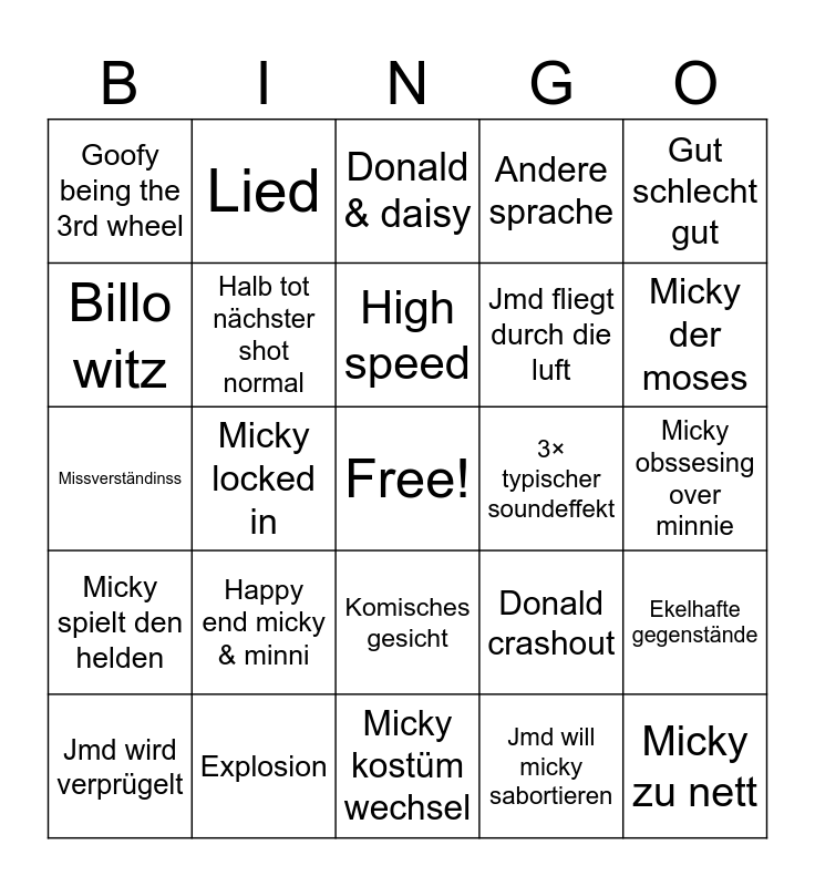 This bingo card has a free space and 24 words: Happy end micky & minni, Explosion, High speed, Jmd wird verprügelt, Gut schlecht gut, Goofy being the 3rd wheel, Billo witz, Lied, 3× typischer soundeffekt, Komisches gesicht, Jmd fliegt durch die luft, Missverständinss, Donald crashout, Ekelhafte gegenstände, Halb tot nächster shot normal, Jmd will micky sabortieren, Micky obssesing over minnie, Donald & daisy, Micky der moses, Micky locked in, Micky zu nett, Micky spielt den helden, Andere sprache and Micky kostüm wechsel.