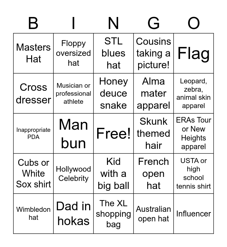 This bingo card has a free space and 24 words: Hollywood Celebrity, Dad in hokas, Honey deuce snake, Wimbledon hat, Flag, Masters Hat, Cross dresser, Floppy oversized hat, Skunk themed hair, Kid with a big ball, Alma mater apparel, Inappropriate PDA, French open hat, USTA or high school tennis shirt, Musician or professional athlete, Australian open hat, ERAs Tour or New Heights apparel, STL blues hat, Leopard, zebra, animal skin apparel, Man bun, Influencer, Cubs or White Sox shirt, Cousins taking a picture! and The XL shopping bag.