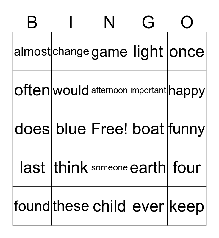 This bingo card has a free space and 24 words: think, these, afternoon, found, once, almost, often, change, boat, someone, important, does, earth, four, would, ever, funny, game, happy, blue, keep, last, light and child.