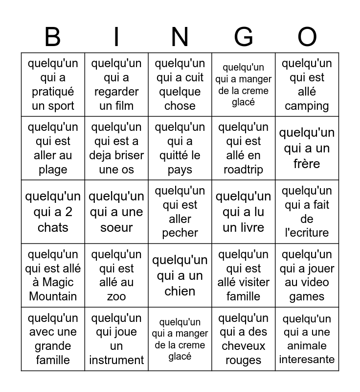 This bingo card has a free space and 24 words: quelqu'un qui est allé au zoo, quelqu'un qui joue un instrument, quelqu'un qui a quitté le pays, quelqu'un avec une grande famille, quelqu'un qui est allé camping, quelqu'un qui a pratiqué un sport, quelqu'un qui est aller au plage, quelqu'un qui a regarder un film, quelqu'un qui a lu un livre, quelqu'un qui a un chien, quelqu'un qui est allé en roadtrip, quelqu'un qui a 2 chats, quelqu'un qui est allé visiter famille, quelqu'un qui a jouer au video games, quelqu'un qui est a deja briser une os, quelqu'un qui a des cheveux rouges, quelqu'un qui a fait de l'ecriture, quelqu'un qui a cuit quelque chose, quelqu'un qui a un frère, quelqu'un qui a une soeur, quelqu'un qui a une animale interesante, quelqu'un qui est allé à Magic Mountain, quelqu'un qui a manger de la creme glacé and quelqu'un qui a manger de la creme glacé.