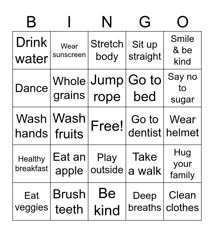 This bingo card has a free space and 24 words: Eat an apple, Brush teeth, Jump rope, Eat veggies, Smile & be kind, Drink water, Dance, Wear sunscreen, Go to dentist, Play outside, Go to bed, Wash hands, Take a walk, Hug your family, Whole grains, Deep breaths, Wear helmet, Stretch body, Say no to sugar, Wash fruits, Clean clothes, Healthy breakfast, Sit up straight and Be kind.