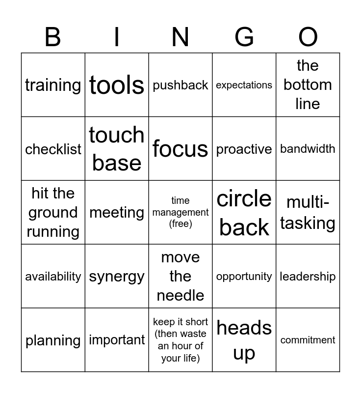 This bingo card has a free space and 24 words: synergy, important, focus, planning, the bottom line, training, checklist, tools, circle back, move the needle, proactive, hit the ground running, opportunity, leadership, touch base, heads up, multi-tasking, pushback, bandwidth, meeting, commitment, availability, expectations and keep it short (then waste an hour of your life).
