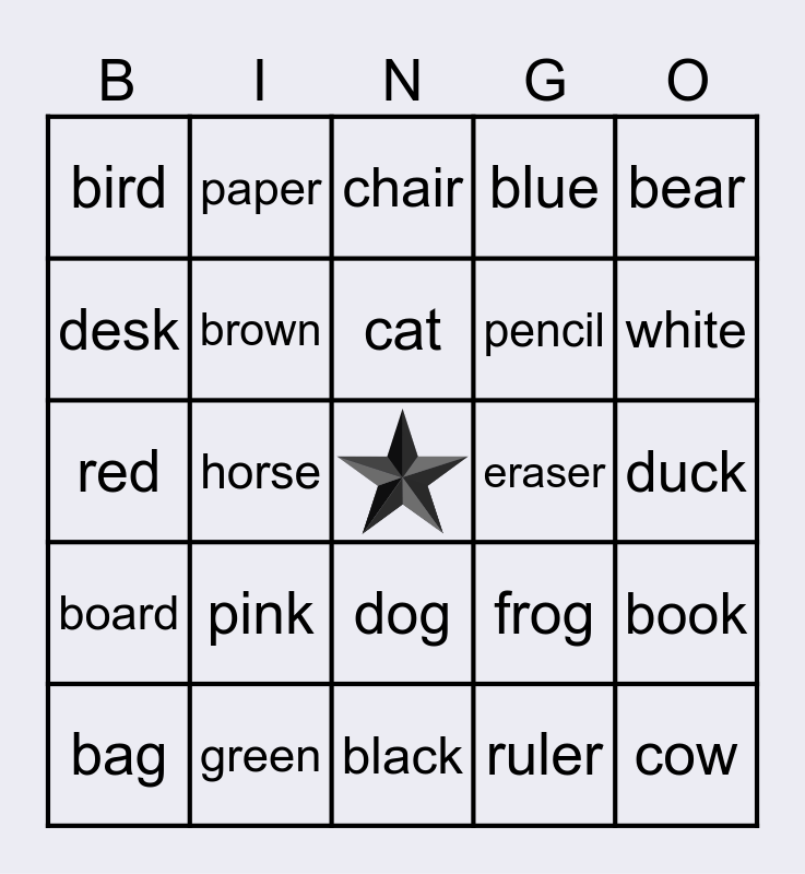 This bingo card has a free space and 28 words: book, pen, pencil, ruler, desk, chair, paper, board, eraser, bag, red, blue, green, black, white, yellow, pink, brown, cat, dog, bird, fish, cow, horse, duck, frog, bear and lion.