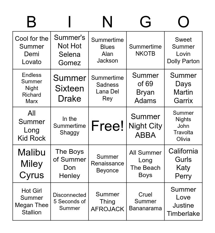 This bingo card has a free space and 24 words: The Boys of Summer Don Henley, Disconnected 5 Seconds of Summer, Summertime Sadness Lana Del Rey, Hot Girl Summer Megan Thee Stallion, Sweet Summer Lovin Dolly Parton, Cool for the Summer Demi Lovato, Endless Summer Night Richard Marx, Summer's Not Hot Selena Gomez, Summer Night City ABBA, Summer Renaissance Beyonce, Summer of 69 Bryan Adams, All Summer Long Kid Rock, All Summer Long The Beach Boys, California Gurls Katy Perry, Summer Sixteen Drake, Cruel Summer Bananarama, Summer Nights John Travolta Olivia, Summertime Blues Alan Jackson, Summer Days Martin Garrix, In the Summertime Shaggy, Summer Love Justine Timberlake, Malibu Miley Cyrus, Summertime NKOTB and Summer Thing AFROJACK.