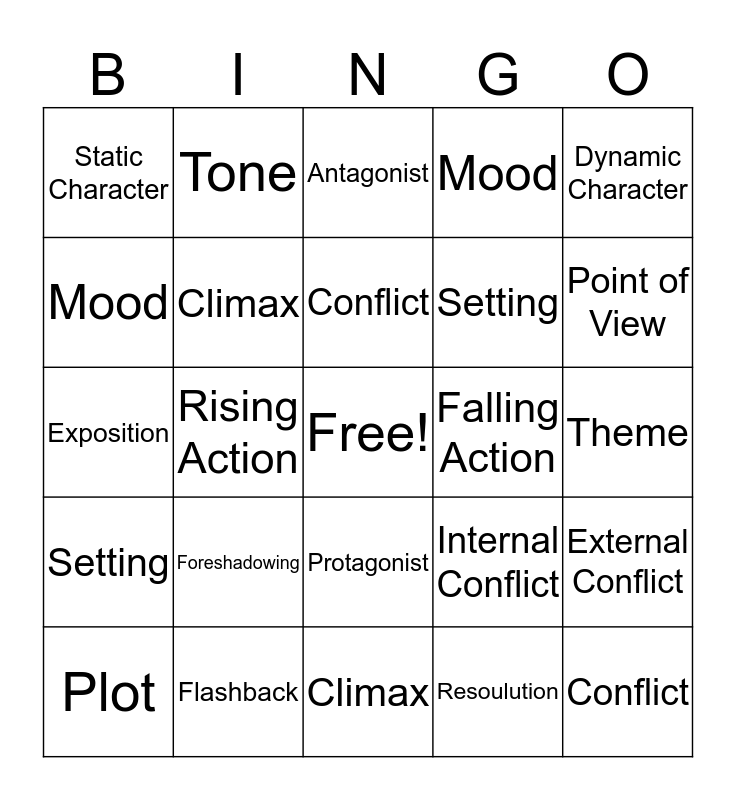 This bingo card has a free space and 24 words: Foreshadowing, Flashback, Conflict, Plot, Dynamic Character, Static Character, Mood, Tone, Falling Action, Protagonist, Setting, Exposition, Internal Conflict, External Conflict, Climax, Resoulution, Theme, Antagonist, Point of View, Rising Action, Conflict, Setting, Mood and Climax.